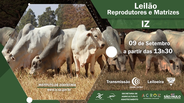 No dia 09 de Setembro de 2021, à partir das 13h30, o Instituto de Zootecnia da Secretaria de Agricultura e Abastecimento do Estado de São Paulo irá disponibilizar, por meio do Leilão de Reprodutores e Matrizes, animais das raças Nelore, Caracu e Guzerá, pertencentes ao Programa de Melhoramento Genético do Instituto de Zootecnia.