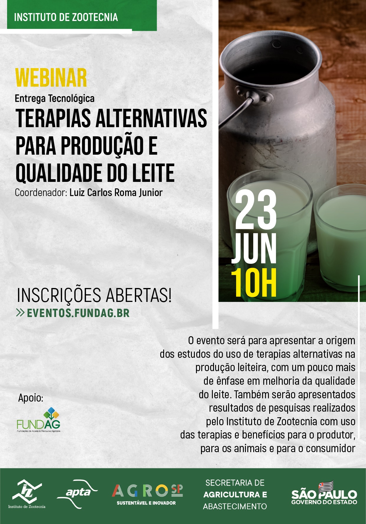 Resumo: O evento será para apresentar a origem dos estudos do uso de terapias alternativas na produção leiteira, com um pouco mais de ênfase em melhoria da qualidade do leite. Também serão apresentados resultados de pesquisas realizados pelo Instituto de Zootecnia com uso das terapias e benefícios para o produtor, para os animais e para o consumidor.