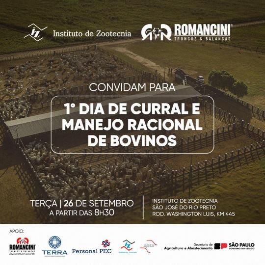 O Instituto de Zootecnia/APTA da Secretaria de Agricultura e Abastecimento do Estado de São Paulo, junto a Romancini, tem o prazer de convida-lo para para participar do nosso 1º Dia de Curral e Manejo Racional de Bovinos. Este evento é uma oportunidade para aprender, discutir e promover práticas mais humanas e eficientes no manejo dos bovinos.