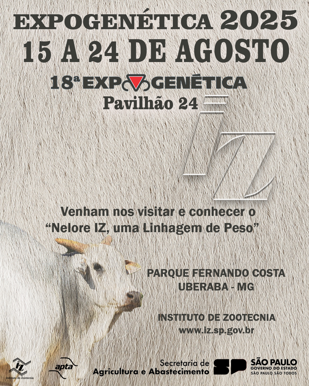 O Instituto de Zootecnia/APTA, da Secretaria de Agricultura e Abastecimento do Estado de São Paulo, tem a grande satisfação de convidar para participar conosco da ExpoGenética – 18ª edição da maior feira de genética zebuína do mundo–, que acontecerá, no período de 15 a 24 de agosto de 2025!