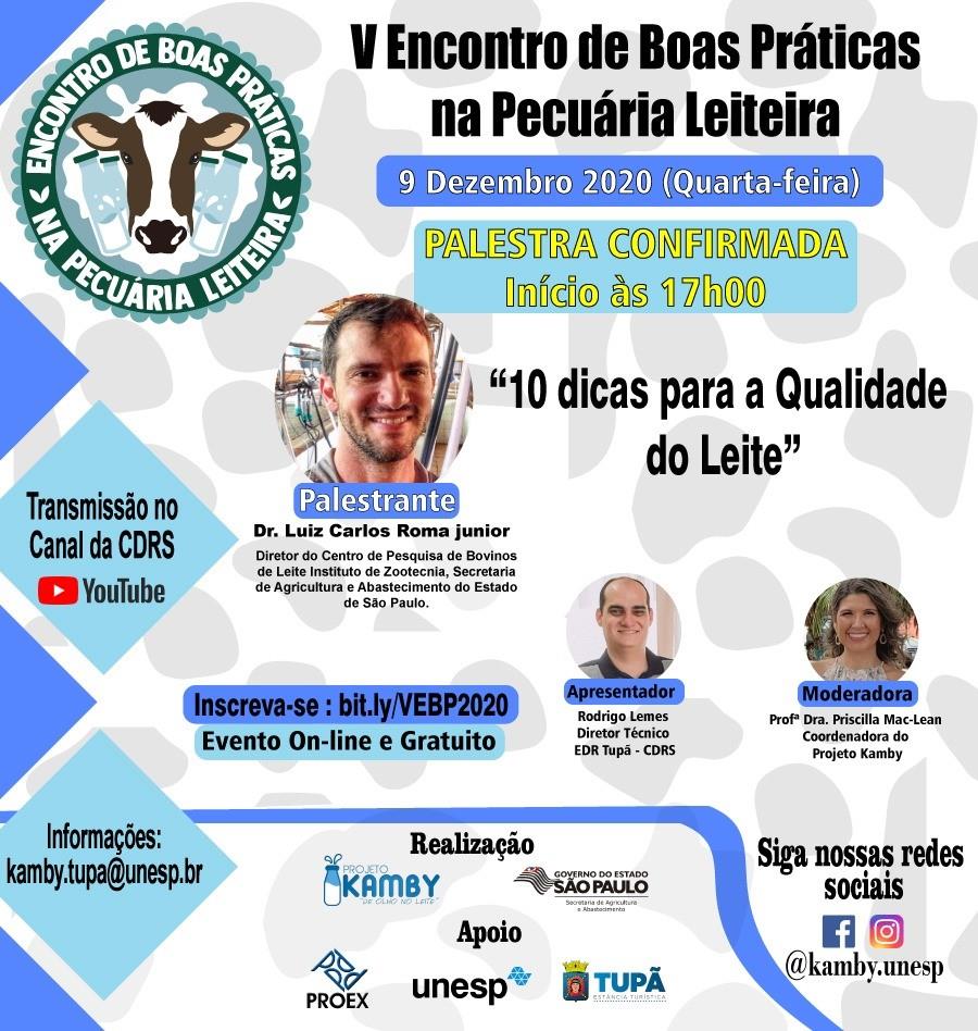 O V Encontro de Boas Práticas na Pecuária Leiteira será realizado nos dias 9 e 10 de dezembro, tendo início, nos dois dias, às 17h, com uma hora de duração. O evento já é tradicional e aborda sempre temas relevantes da cadeia produtiva leiteira. No dia 9, quarta-feira, o pesquisador Luiz Carlos Roma Junior, do Instituto de Zootecnia (IZ/SAA) abordará a qualidade do leite com a palestra "10 dicas para a Qualidade do Leite" e no dia 10 de dezembro, o Me. Antonio Chaker Neto, coordenador do Instituto Inttegra, conversará sobre a gestão da cadeia leiteira com a palestra "Fatores decisivos ao êxito da atividade pecuária".