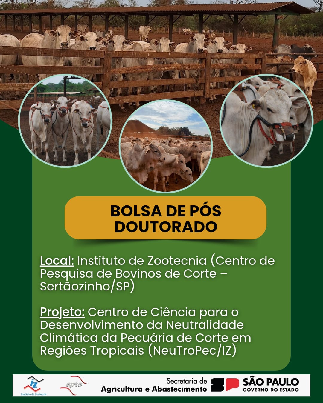 25/02/2026 Oportunidade de Pós-Doutorado no IZ na área de Melhoramento Animal O Instituto de Zootecnia (IZ–APTA), da Secretaria de Agricultura e Abastecimento do Estado de SP, divulga vaga de Pós-Doutorado em Melhoramento Animal vinculada ao projeto Centro de Ciência para o Desenvolvimento da Neutralidade Climática da Pecuária de Corte em Regiões Tropicais (NeuTroPec/IZ) com o apoio da FAPESP.