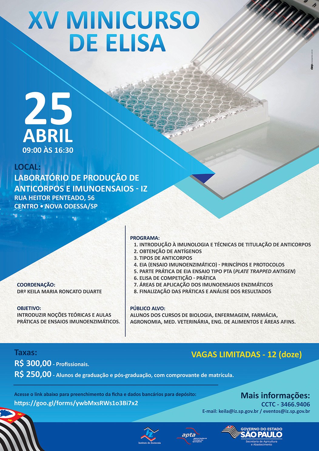 Local: Laboratório de Produção de Anticorpos e Imunoensaios - I.Z. Rua Heitor Penteado, 56 - centro - Nova Odessa/SP