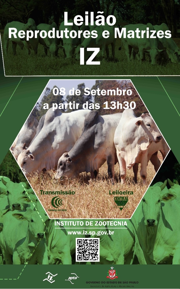 No dia 08 de Setembro de 2022, à partir das 13h30, o Instituto de Zootecnia da Secretaria de Agricultura e Abastecimento do Estado de São Paulo irá disponibilizar, por meio do Leilão de Reprodutores e Matrizes, animais das raças Nelore e Caracu, pertencentes ao Programa de Melhoramento Genético do Instituto de Zootecnia.