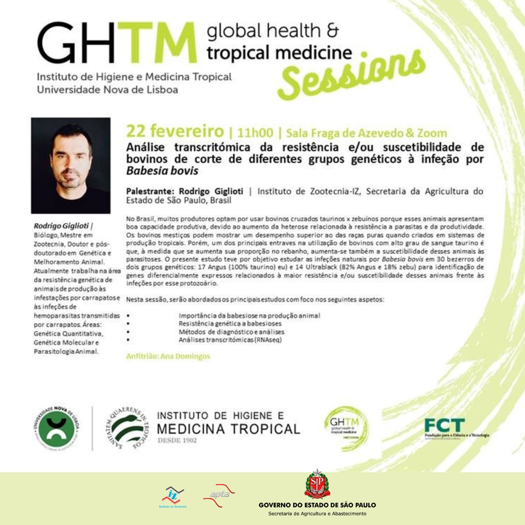 O Instituto de Zootecnia (IZ-APTA), da Secretaria de Agricultura e Abastecimento do Estado de São Paulo, em parceria com Global Health and Tropical Medicine – GHTM da Universidade NOVA de Lisboa, Portugal, realizará no dia 22/02/2023 às 8h (Devido ao fuso horário Lisboa, Portugal está 3 horas à frente de Brasília - DF), Palestra: Análise transcritómica da resistência e/ou suscetibilidade de bovinos de corte de diferentes grupos genéticos à infecção por Babesia bovis, ministrada por Rodrigo Giglioti