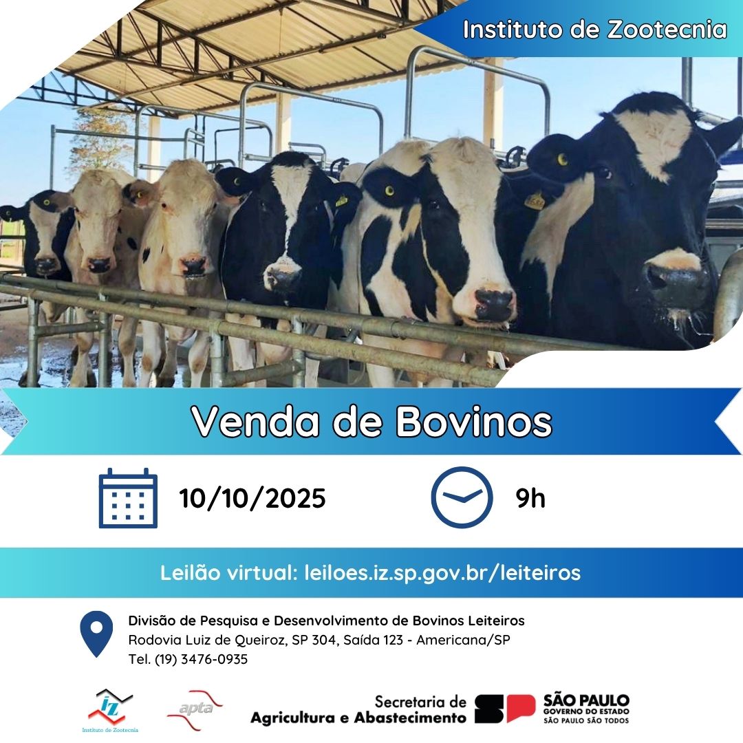 O Instituto de Zootecnia (IZ-APTA), da Secretaria de Agricultura e Abastecimento do Estado de SP, realizará Leilão Virtual de Bovinos: