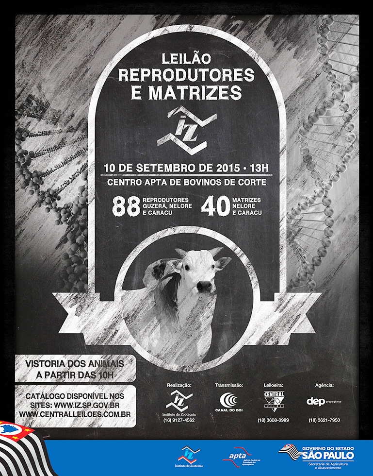 Disponível o pré-catálogo com as informações dos bovinos que serão disponibilizados para a venda no leilão de reprodutores e matrizes, no dia 10 de setembro, às 13 horas, no Centro de Pesquisa em Bovinos de Corte do Instituto de Zootecnia (IZ), em Sertãozinho (SP). A vistoria dos animais é a partir das 10 horas.