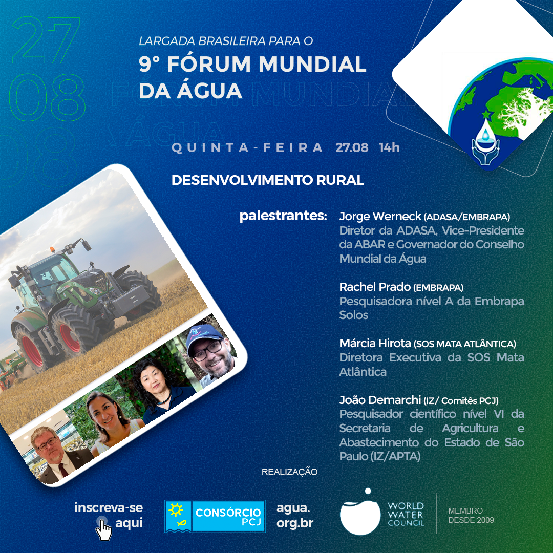 Com o tema “Desenvolvimento Rural”, o segundo dia da webinar "Largada Brasileira para o 9º Fórum Mundial da Água", que ocorre hoje, 27de agosto, às 14 horas, conta com a participação do pesquisador científico do Instituto de Zootecnia (IZ-APTA), da Secretaria de Agricultura e Abastecimento do Estado de São Paulo, João José Assumpção de Abreu Demarchi, também coordenador da Câmara Técnica de Recursos Naturais dos Comitês PCJ - Consórcio Intermunicipal das Bacias dos Rios Piracicaba, Capivari e Jundiaí.
