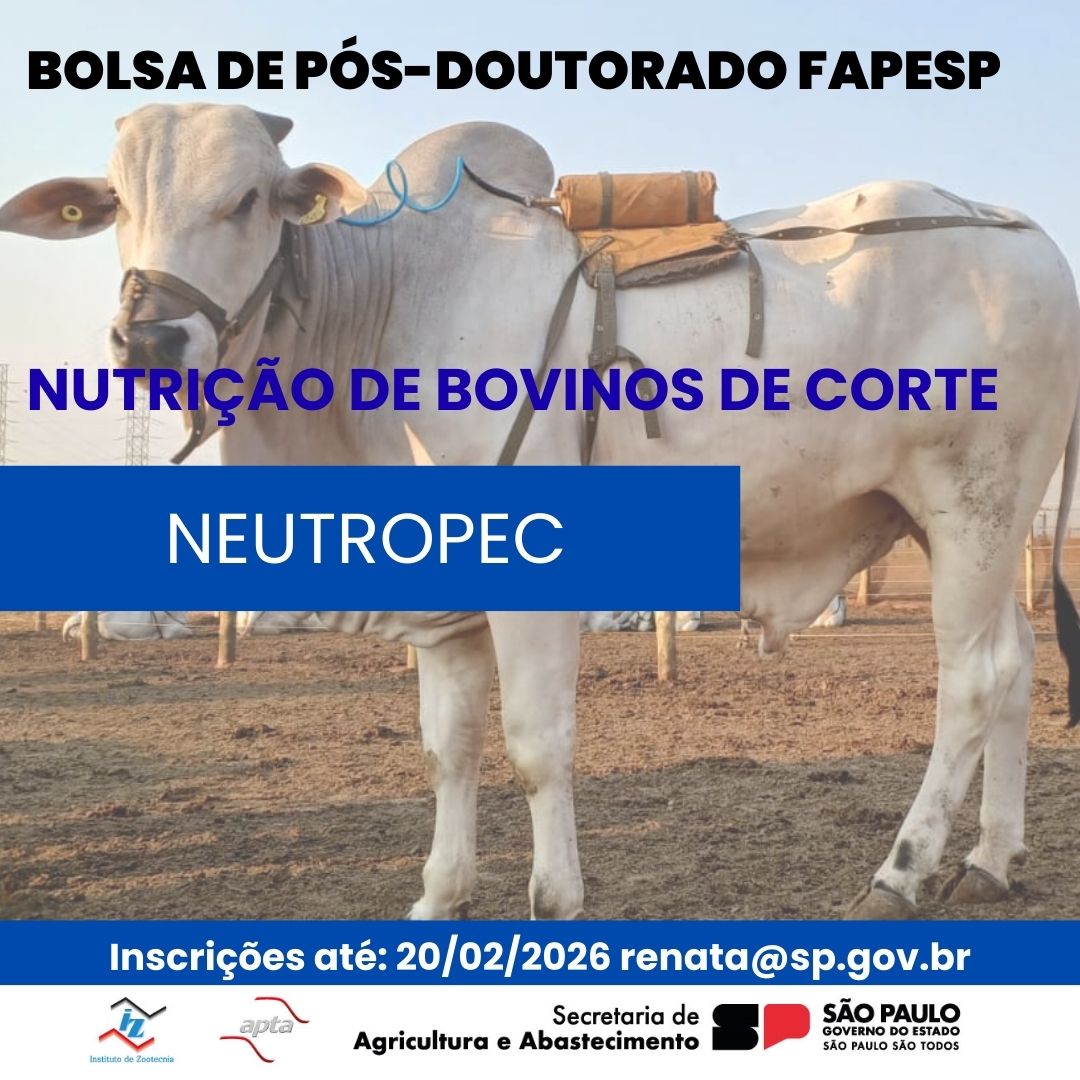 Zootecnia (IZ–APTA), da Secretaria de Agricultura e Abastecimento do Estado de SP, divulga vaga de Pós-Doutorado em Nutrição de Bovinos de Corte. Aberta para